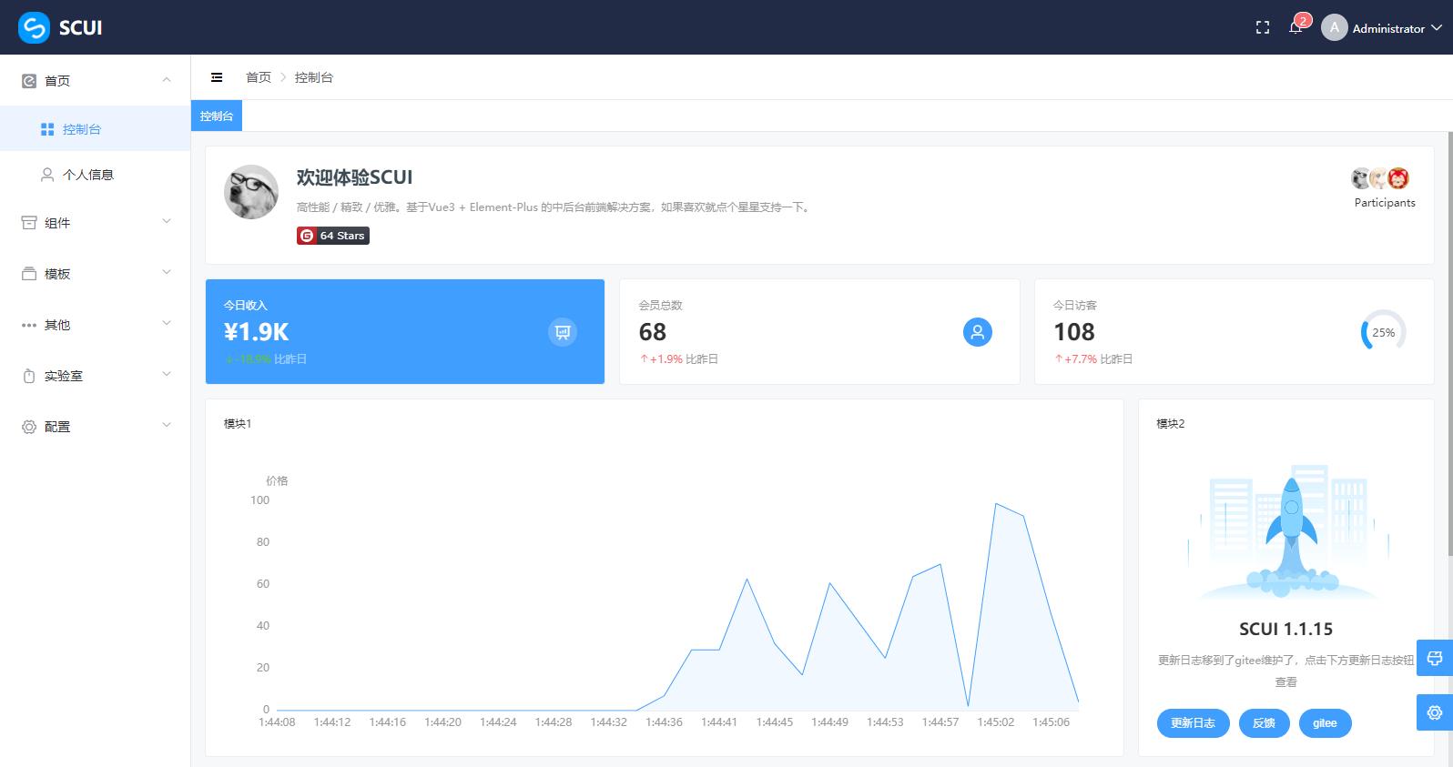 SCUI提供4套布局方案,分别是默认的分栏布局和头部导航布局,均可在配置中设置。